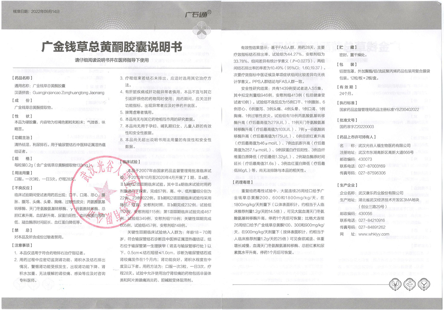 每粒装0.2g(含广金钱草总黄酮提取物133mg)